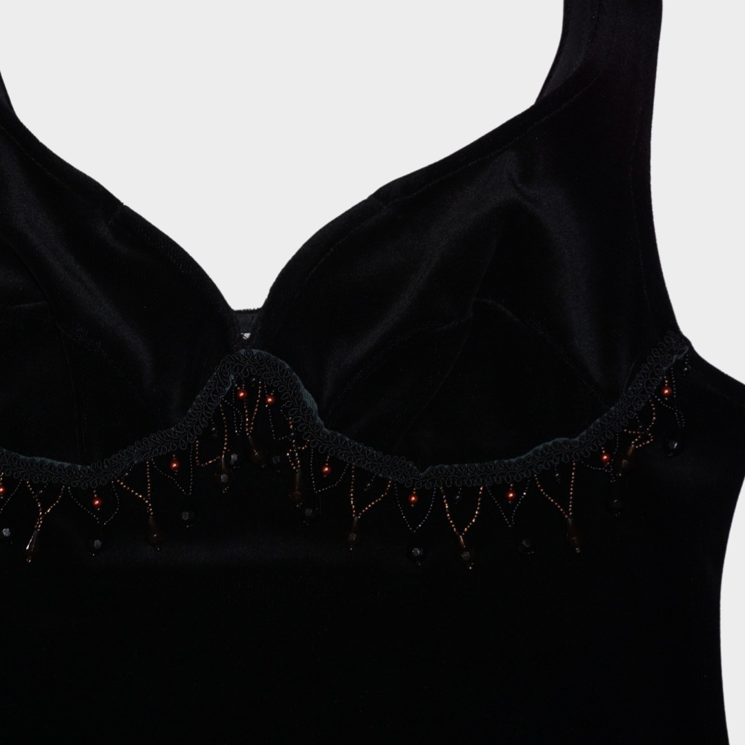 Vintage velvet dress with beaded bust decorations. Stretchy quality.